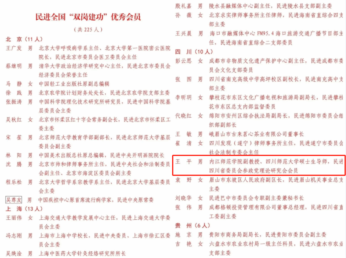我校民进支部主委、大千中心专职研究员王平凭借在参政党理论研究和参政议政方面的突出表现,荣获民进中央“民进全国‘双岗建功’优秀会员”和“民进全国会史工作先进个人”两项荣誉称号。王平主持的民进中央理论研究课题成果《民进各领域代表人士生平研究:刘西林评传》同时获得民进中央“民进全国会史研究优秀成果”表彰。