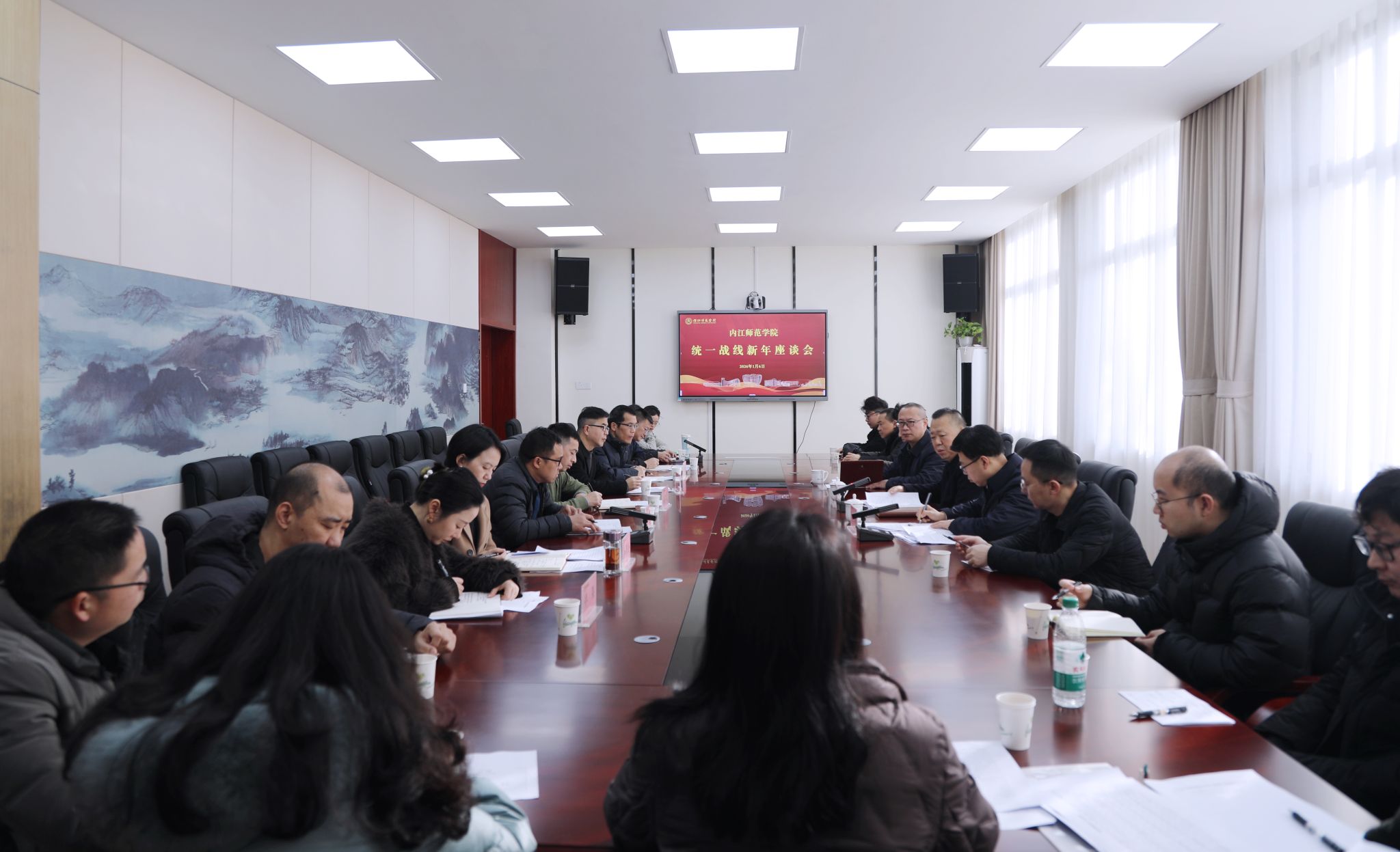 1月6日上午,内江师范学院2026年统一战线新年座谈会在行知楼B101举行。学校党委书记黄永忠,党委副书记胡金朝与各民主党派、无党派人士、知联会、侨联代表欢聚一堂,畅叙情谊、沟通思想、听取意见、共谋发展。会议由胡金朝主持。