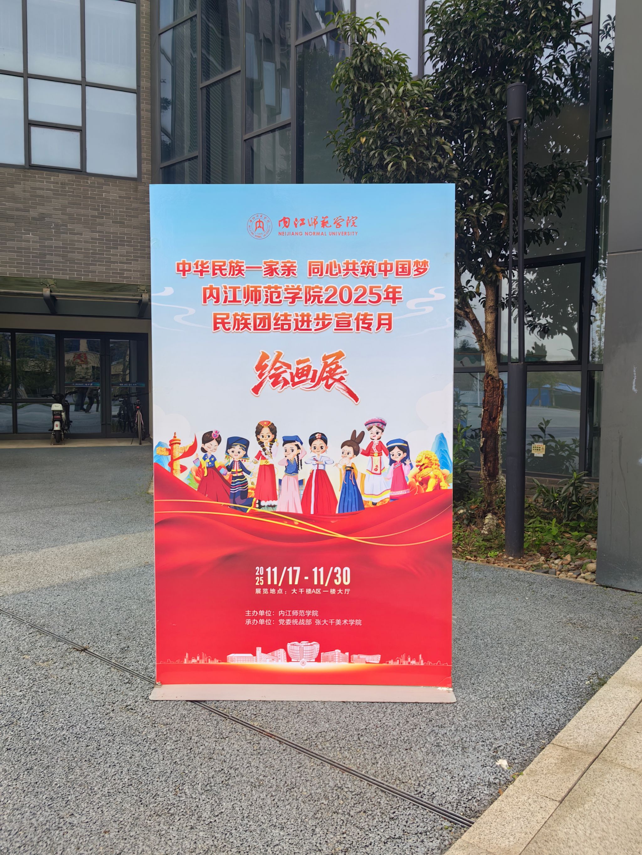 本次展览是民族团结进步宣传月的系列活动之一,由内江师范学院主办,党委统战部与张大千美术学院共同承办,集中展出了一批主题鲜明、形式多样的优秀书画作品。展览涵盖中国画、书法、手抄报、海报设计、版画、扎染等多种艺术形式,生动展现了各民族文化的独特魅力与民族团结进步的深刻内涵。