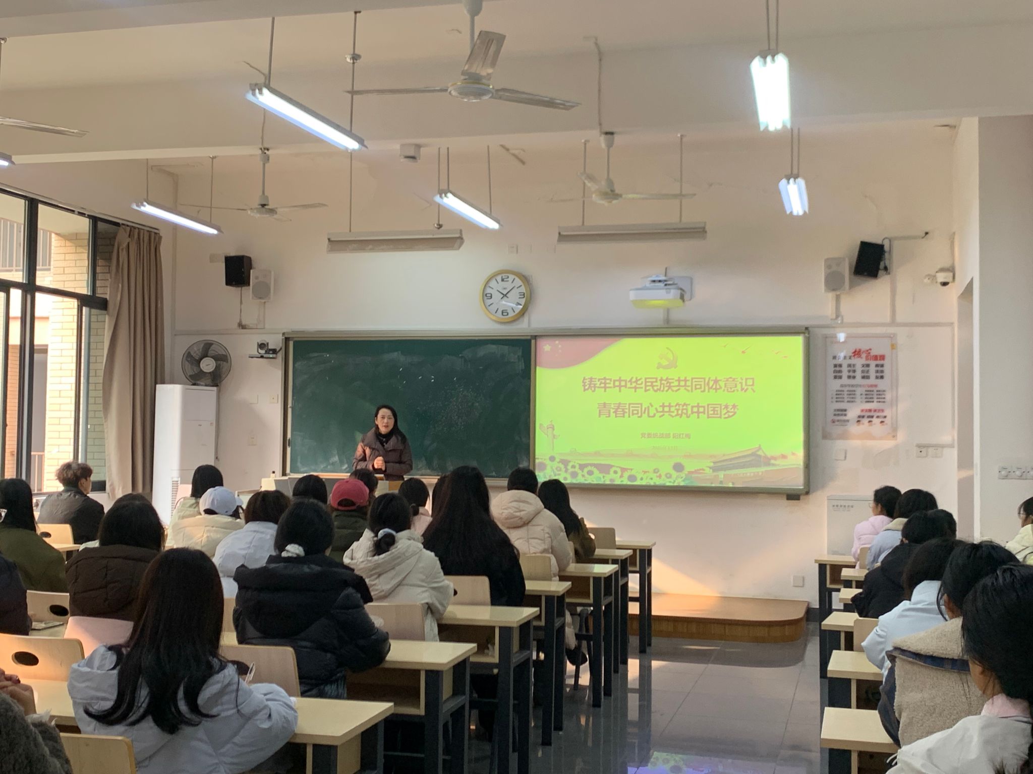 在《铸牢中华民族共同体意识 青春同心共筑中国梦》主题讲座上,阳红梅结合班级多民族特点,以“各民族共融共筑”为核心,用鲜活的民族团结案例,引导学生深化民族共同体认知,现场各民族同学认真聆听、积极互动,思想共识在交流中凝聚。